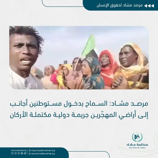 يدين مرصد مشاد لحقوق الإنسان بأشد العبارات التطور الخطير الذي شهدته الساحة السودانية خلال الأيام الخمسة الماضية، والمتمثل في سماح قوات الدعم السريع لمجموعات وافدة من إفريقيا الوسطى والنيجر وتشاد بالدخول إلى الأراضي السودانية والاستقرار في مناطق المدنيين الذين جرى تهجيرهم قسرًا من قراهم في إقليم دارفور. وقد رصد المرصد من خلال مصادره وآلياته الميدانية دخول أكثر من ٢٠٠٠ أسرة أجنبية تحمل ماشيتها وممتلكاتها وتتخذ من المناطق التي فُرغت من سكانها الأصليين مواقع للاستيطان والتمركز، في انتهاك صارخ لسيادة السودان واعتداء مباشر على حقوق المجتمعات المحلية التي تعرّضت للنزوح القسري، بما يكشف عن وجود مخطط منظم لإعادة تشكيل الخريطة الديمغرافية عبر إحلال مجموعات غير سودانية مكان السكان الأصليين الذين هُجّروا قسرًا.