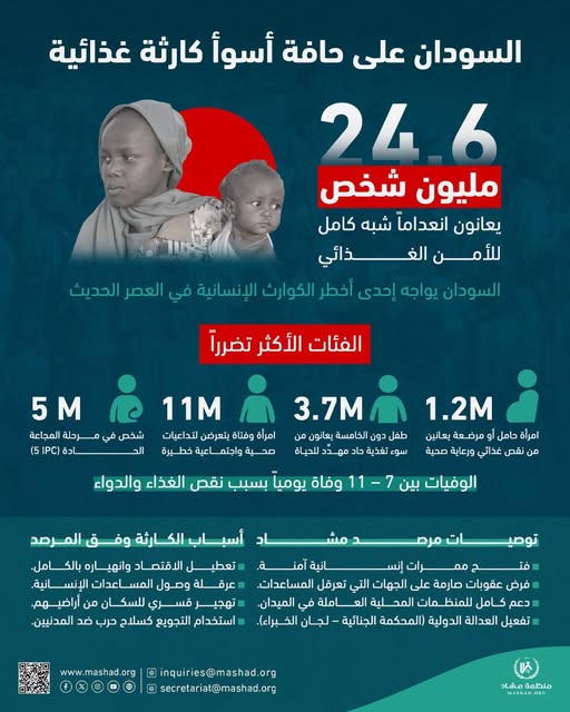 السودان اليوم يواجه أزمة تهدد حياة أكثر من نصف سكانه، وكل يوم يمر يضيف المزيد من الأرواح إلى قائمة الضحايا ويعمّق معاناتهم إلى مستويات غير مسبوقة، مما يجعل المجتمع الدولي أمام مسؤولية أخلاقية وتاريخية لاتخاذ إجراءات فورية لإنقاذ الملايين قبل فوات الأوان. إن السماح باستمرار هذا الواقع سيجعل السودان مسرحاً لأكبر مأساة إنسانية في القرن الحادي والعشرين، وسيظل صمت العالم وتقاعسه وصمة لا تُمحى في سجل التاريخ