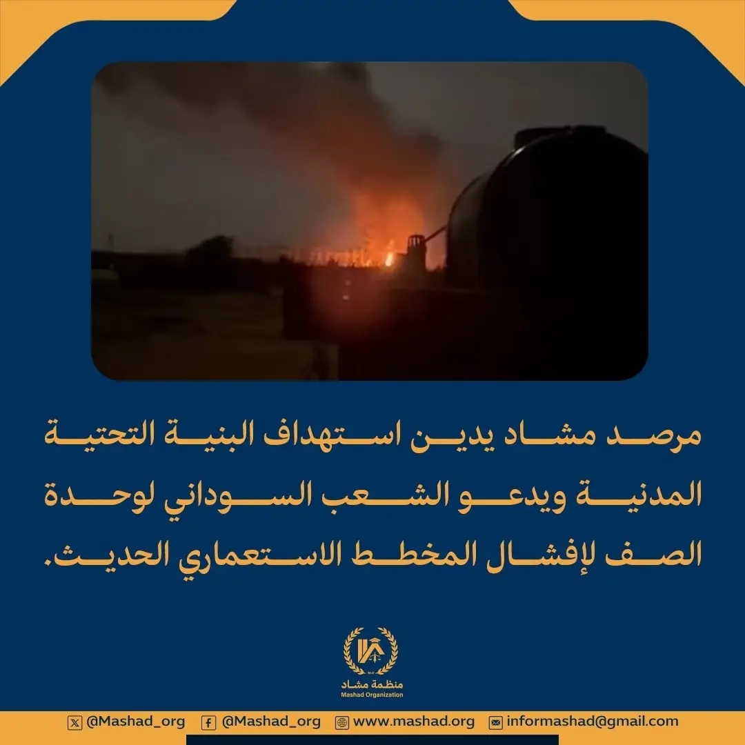 يدين مرصد مشاد بشدة الهجوم الخطير الذي نفذته قوات الدعم السريع مستهدفة محطة كهرباء المريخيات غرب أم درمان ومحطة الكهرباء في بحري بواسطة طائرات انتحارية مسيّرة، في جريمة بشعة تستهدف منشآت حيوية مدنية تشكل شريان حياة لملايين المواطنين.