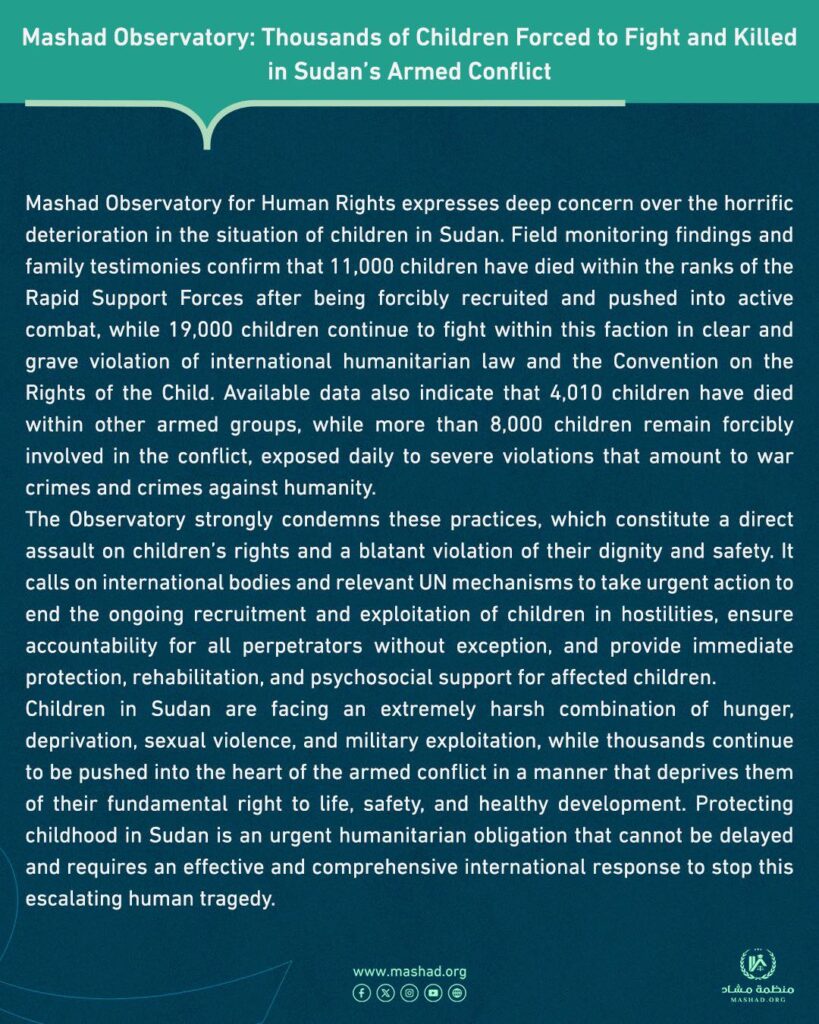 مرصد مشهد لحقوق الإنسان يعرب عن بالغ قلقه من التدهور المروع في وضع الأطفال في السودان. نتائج الرصد الميداني والشهادات العائلية تؤكد وفاة 11000 طفل ضمن صفوف قوات الدعم السريع بعد تجنيدهم قسرا ودفعهم في القتال النشط، بينما يواصل 19000 طفل القتال داخل هذا الفصيل في انتهاك واضح وجسيم للقانون الإنساني الدولي والاتفاقية بشأن حقوق الطفل. وتشير البيانات المتاحة أيضا إلى أن 010 4 أطفال لقوا حتفهم ضمن مجموعات مسلحة أخرى، بينما لا يزال أكثر من 8000 طفل متورطين قسرا في الصراع، ويتعرضون يوميا لانتهاكات جسيمة ترقى إلى حد جرائم حرب وجرائم ضد الإنسانية.