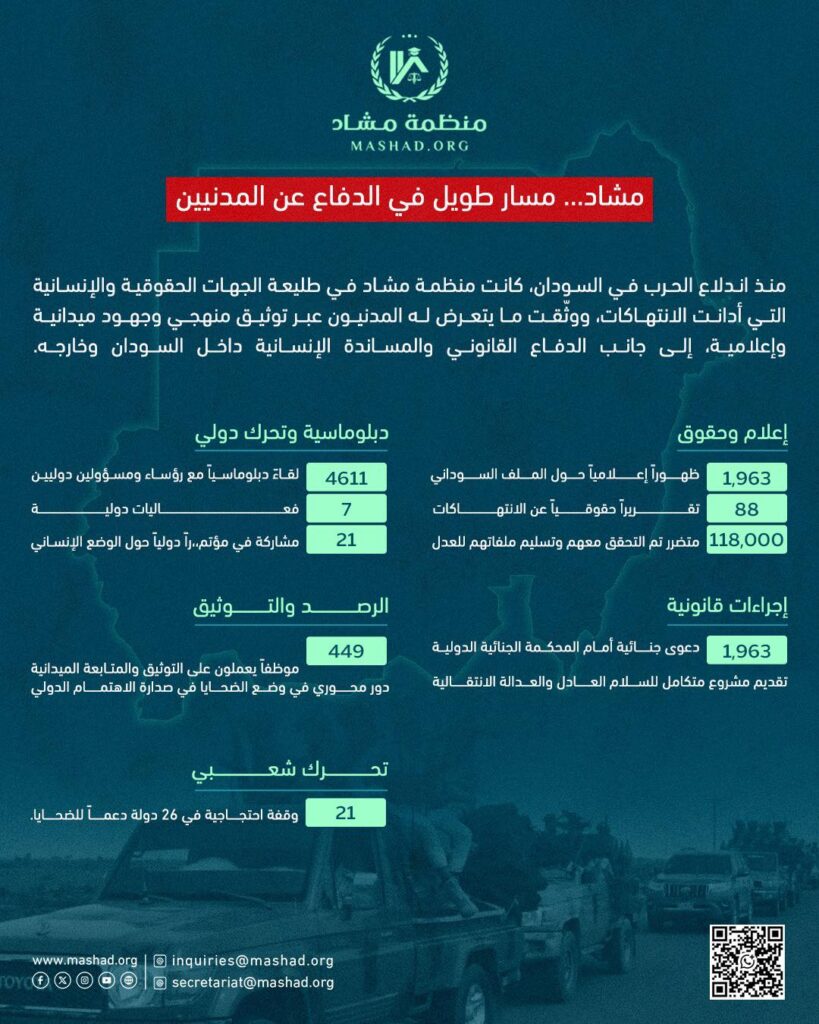 كما أجرت مشاد تحقيقات موسعة مع 118,000 مواطن داخل السودان وخارجه ممّن تعرضوا لانتهاكات، وتم تسليم ملفاتهم للجهات العدلية والحقوقية الإقليمية والدولية، بما يعكس حجم المأساة التي يعيشها المدنيون.