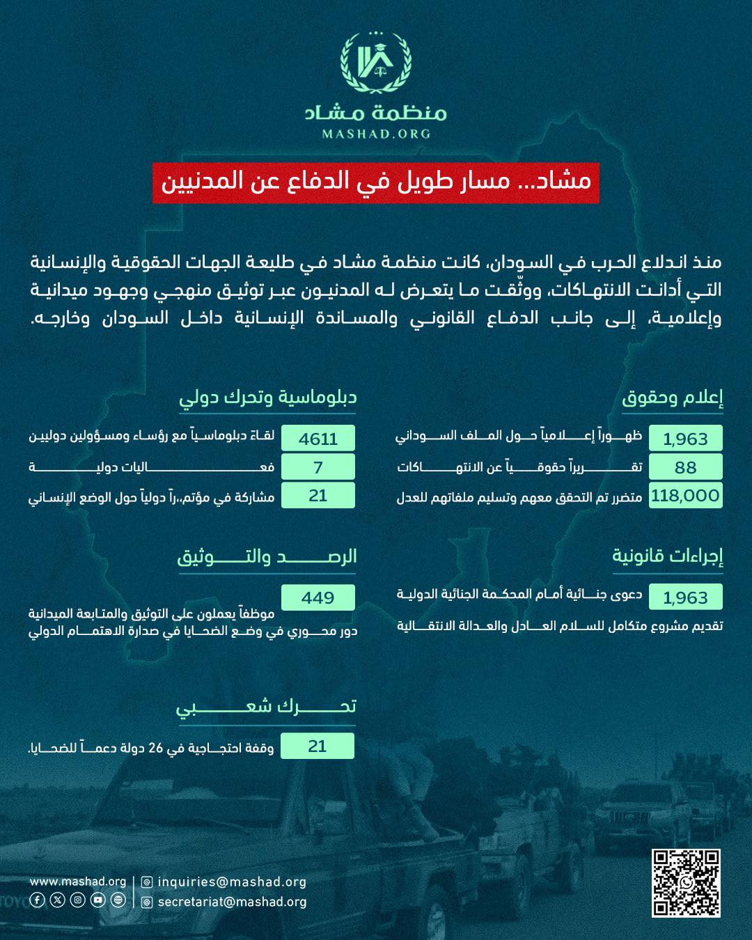 وفي الجانب الدبلوماسي، عقدت مشاد 4,611 لقاءً مع رؤساء دول ووزراء خارجية ومسؤولين دوليين وقيادات منظمات إقليمية وعالمية، بهدف كسب الدعم القانوني وتحريك مواقف دولية واضحة تجاه الانتهاكات واسعة النطاق التي يواجهها المدنيون في السودان.