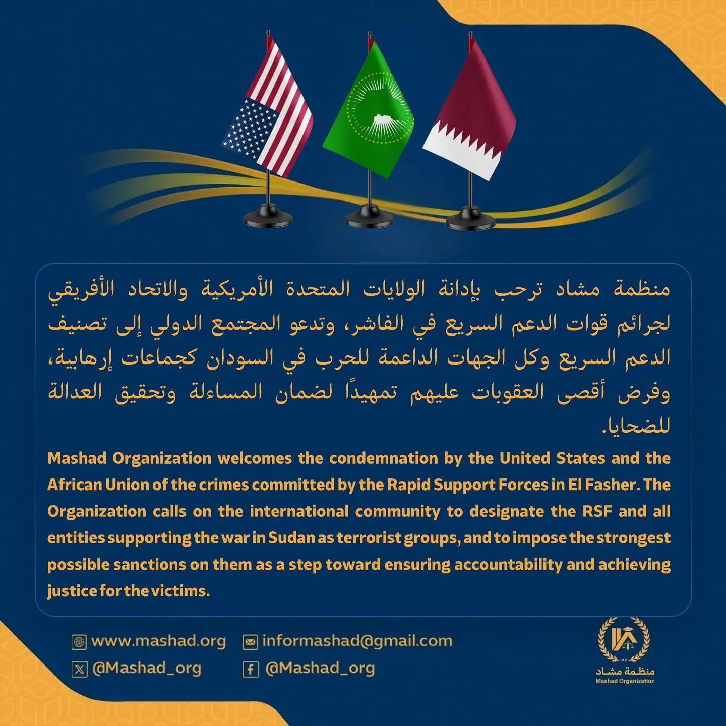 Mashad Organization welcomes the condemnation by the United States, the African Union, and the State of Qatar of the crimes committed by the Rapid Support Forces in El Fasher. The Organization calls on the international community to designate the RSF and all entities supporting the war in Sudan as terrorist groups, and to impose the strongest possible sanctions on them as a step toward ensuring accountability and achieving justice for the victims.