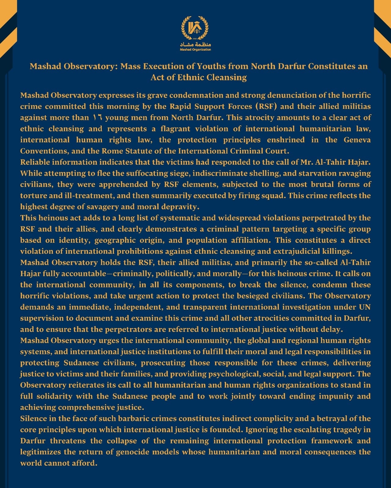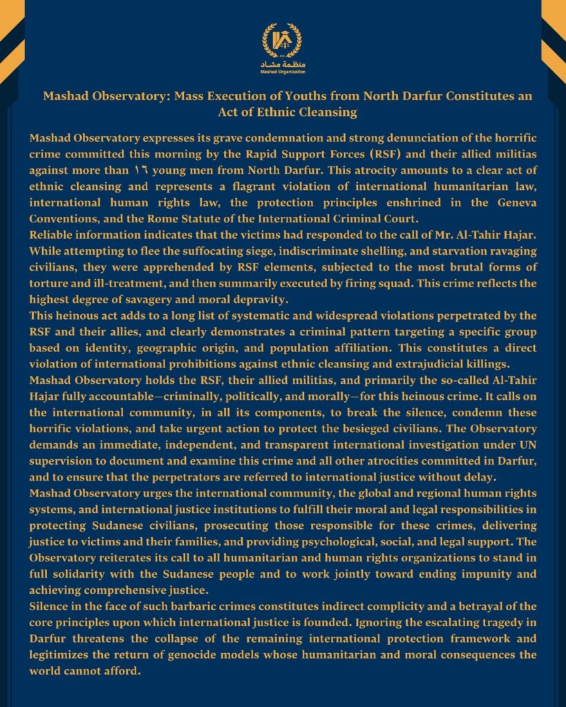 Mashad Observatory expresses its grave condemnation and strong denunciation of the horrific crime committed this morning by the Rapid Support Forces (RSF) and their allied militias against more than 16 young men from North Darfur. This atrocity amounts to a clear act of ethnic cleansing and represents a flagrant violation of international humanitarian law, international human rights law, the protection principles enshrined in the Geneva Conventions, and the Rome Statute of the International Criminal Court.