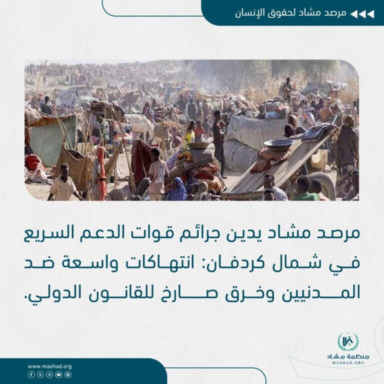 إننا في مرصد مشاد نؤكد أن هذه الأفعال تمثل جرائم حرب وجرائم ضد الإنسانية، ونطالب بضرورة تدخل دولي عاجل لحماية المدنيين، وفتح تحقيق شفاف يضمن محاسبة المسؤولين عن هذه الانتهاكات الجسيمة. Mashad Human Rights Observatory:We express our deep concern and…