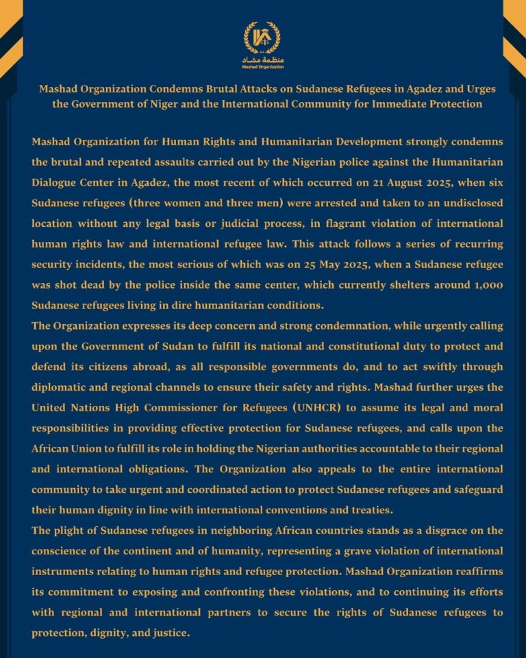 تدين منظمة مشاد لحقوق الإنسان والتنمية الإنسانية بأشد العبارات الهجوم الوحشي والمتكرر الذي نفذته الشرطة النيجيرية على مركز الحوار الإنساني بمدينة أغاديش، وكان آخره بتاريخ…