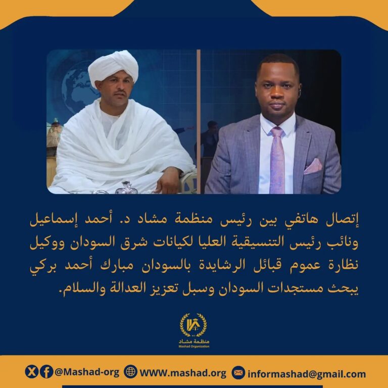 اتصال هاتفي بين رئيس منظمة مشاد د. أحمد إسماعيل ونائب رئيس التنسيقية العليا لكيانات شرق السودان ووكيل نظارة عموم قبائل الرشايدة بالسودان مبارك أحمد بركي…