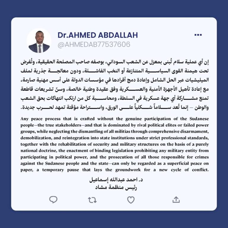 إن أي عملية سلام تُبنى بمعزل عن الشعب السوداني، بوصفه صاحب المصلحة الحقيقية، وتُفرض تحت هيمنة القوى السياسية المتنازعة أو النخب الفاشلة، ودون معالجة جذرية…