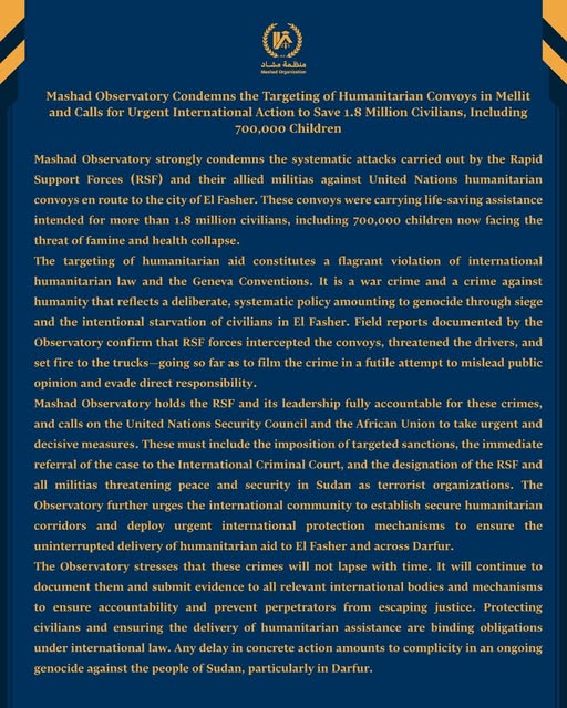 Mashad Observatory strongly condemns the systematic attacks carried out by the Rapid Support Forces (RSF) and their allied militias against United Nations humanitarian convoys en…