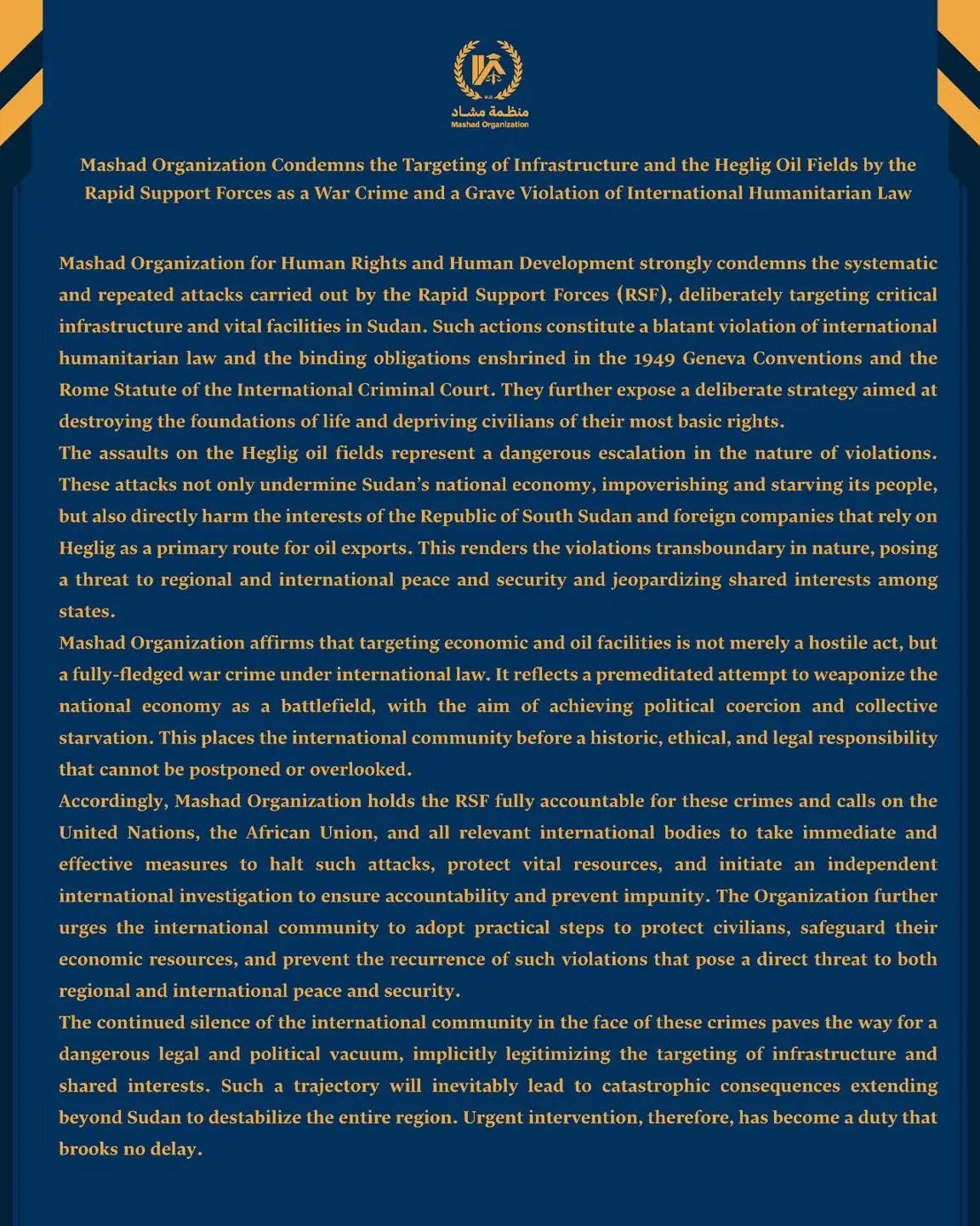 Accordingly, Mashad Organization holds the RSF fully accountable for these crimes and calls on the United Nations, the African Union, and all relevant international bodies to take immediate and effective measures to halt such attacks, protect vital resources, and initiate an independent international investigation to ensure accountability and prevent impunity. The Organization further urges the international community to adopt practical steps to protect civilians, safeguard their economic resources, and prevent the recurrence of such violations that pose a direct threat to both regional and international peace and security.