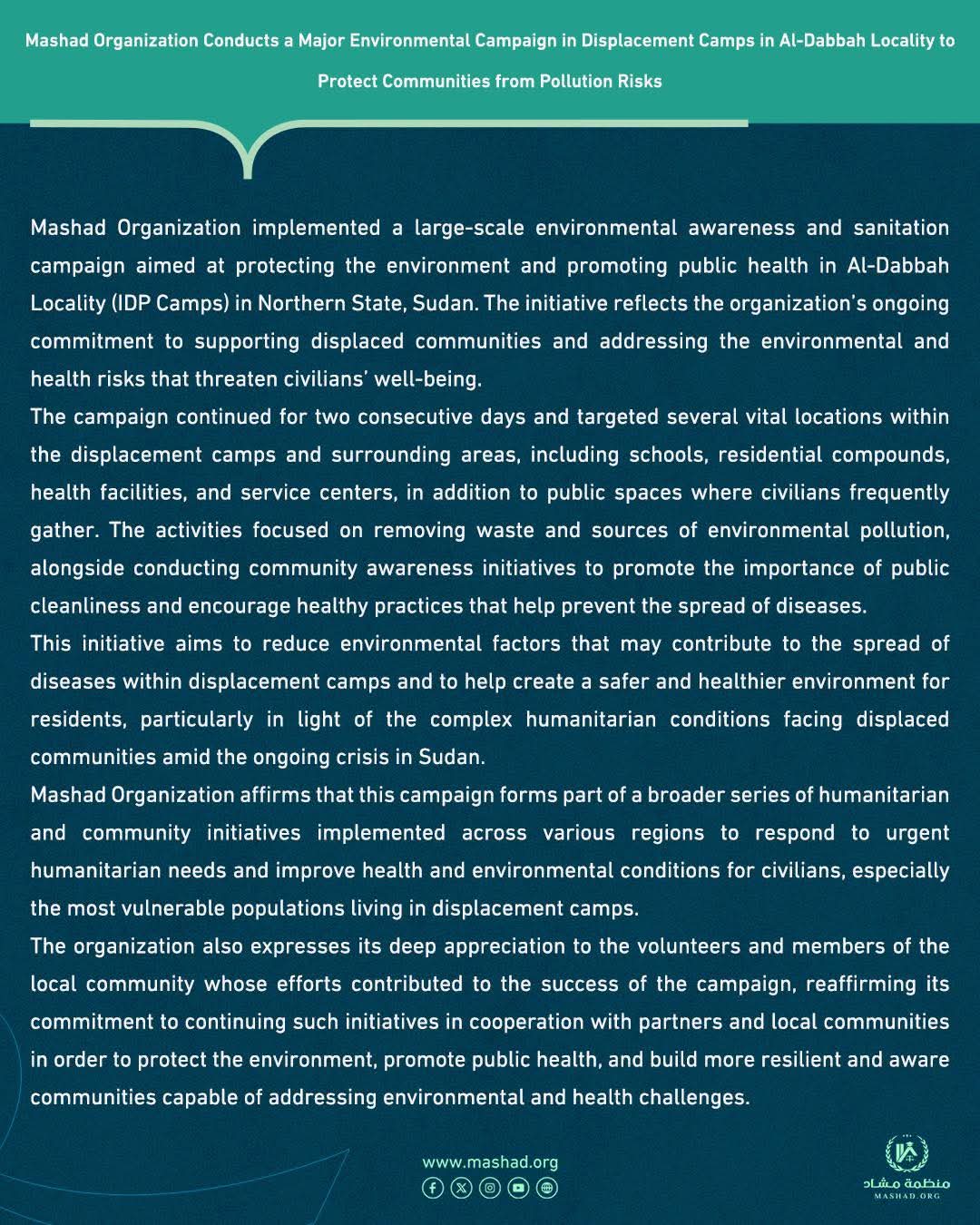 Mashad Organization implemented a large-scale environmental awareness and sanitation campaign aimed at protecting the environment and promoting public health in Al-Dabbah Locality (IDP Camps) in Northern State, Sudan. The initiative reflects the organization’s ongoing commitment to supporting displaced communities and addressing the environmental and health risks that threaten civilians’ well-being.The campaign continued for two consecutive days and targeted several vital locations within the displacement camps and surrounding areas, including schools, residential compounds, health facilities, and service centers, in addition to public spaces where civilians frequently gather. The activities focused on removing waste and sources of environmental pollution, alongside conducting community awareness initiatives to promote the importance of public cleanliness and encourage healthy practices that help prevent the spread of diseases.This initiative aims to reduce environmental factors that may contribute to the spread of diseases within displacement camps and to help create a safer and healthier environment for residents, particularly in light of the complex humanitarian conditions facing displaced communities amid the ongoing crisis in Sudan.Mashad Organization affirms that this campaign forms part of a broader series of humanitarian and community initiatives implemented across various regions to respond to urgent humanitarian needs and improve health and environmental conditions for civilians, especially the most vulnerable populations living in displacement camps.The organization also expresses its deep appreciation to the volunteers and members of the local community whose efforts contributed to the success of the campaign, reaffirming its commitment to continuing such initiatives in cooperation with partners and local communities in order to protect the environment, promote public health, and build more resilient and aware communities capable of addressing environmental and health challenges.