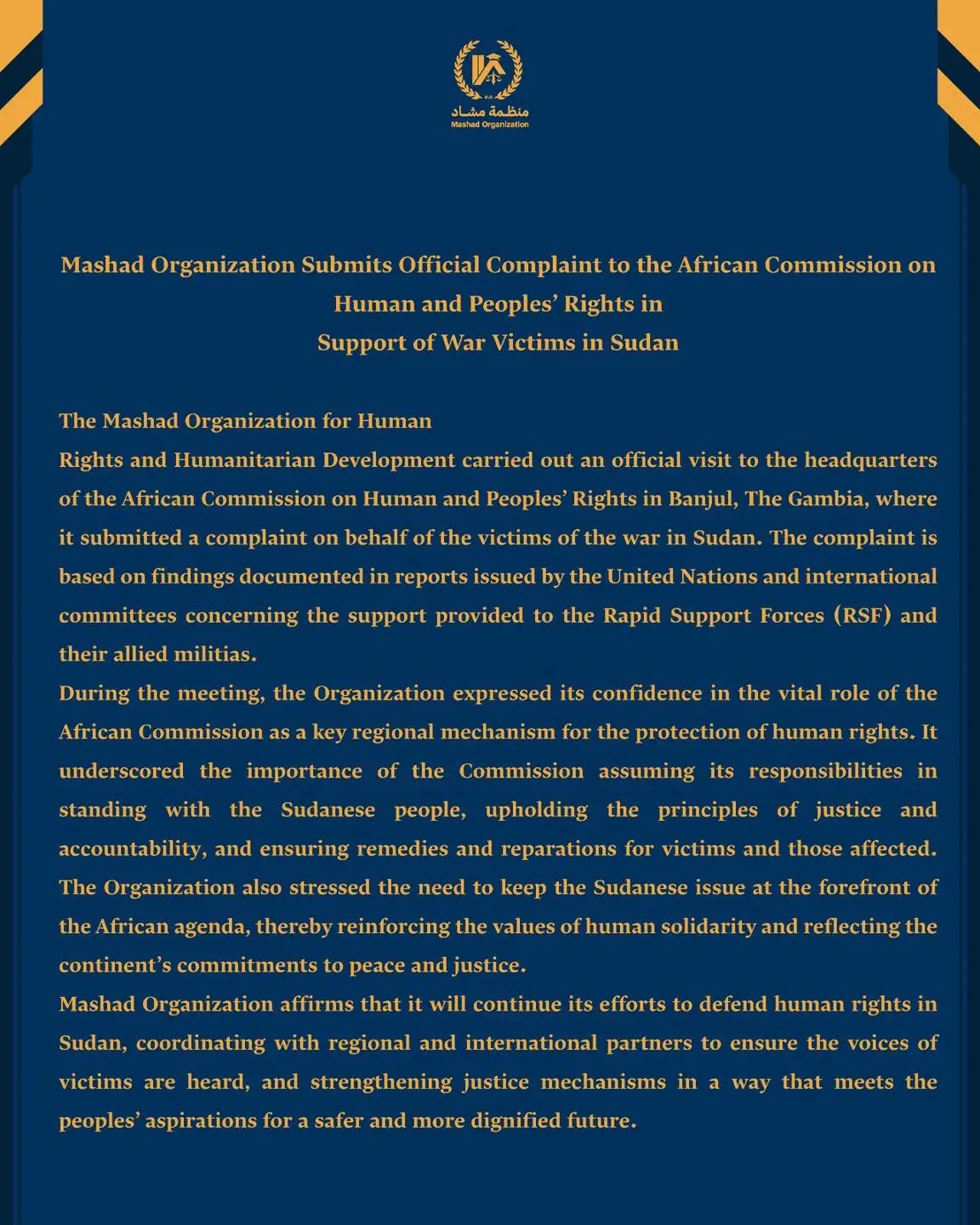 Mashad Organization affirms that it will continue its efforts to defend human rights in Sudan, coordinating with regional and international partners to ensure the voices of victims are heard, and strengthening justice mechanisms in a way that meets the peoples’ aspirations for a safer and more dignified future.