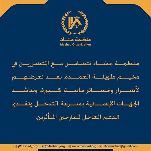 منظمة مشاد تتضامن مع المتضررين في مخيم طويلة العمدة، بعد تعرضهم لأضرار وخسائر مادية كبيرة. ونناشد الجهات الإنسانية بسرعة التدخل وتقديم الدعم العاجل للنازحين المتأثرين.